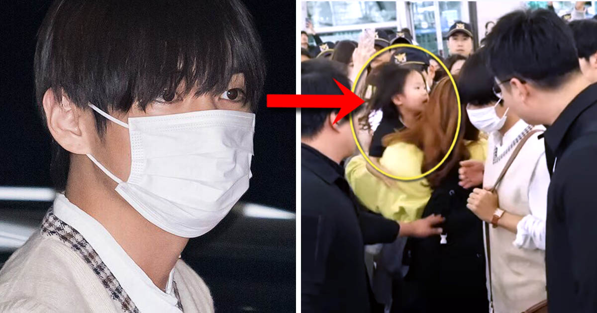 ڤي عضو فرقة بانقتان ساعد امرأة سقطت على الأرض وطفلة صغيرة في مطار إنتشون الدولي